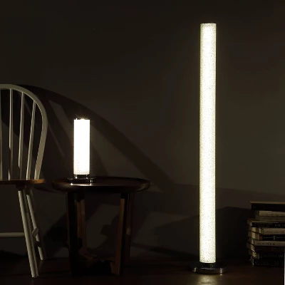 Dynamic lighting designs to accentuate and compliment any space. From conceptualization to reality, Illuminari White Crystal Sandrocks Column Table Lamp features a shiny Chrome steel base. PET polyester tube diffuser. Provides both direct and indirect light from one LED tower light source. Clear tube is filled with hundreds of white crystal sandrocks surrounding white LEDs, as the lights slowly phase, the sandrocks catch and refract the light for a dazzling effect. When a room calls for understated modernism, this table lamp answers with the perfect balance of minimalism and statement-making design. The energy-efficient integrated built-in LEDs cast a bright glow from the slim line bar base. Eco-friendly fixture for your home. Serve as great sources of light but is more than attractive enough to be classed as an ornament and could certainly rival the aesthetic appeal of any sculpture you may have on display.