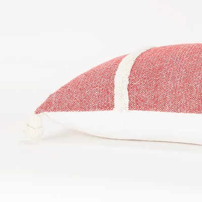 This woven knife edged pillow features a two color weave that lightens the color and gives this pillow an artisinally crafted look. Soft cotton dimensional rows lend a striped appearance to this non-solid solid pillow. Four plump hand crafted cotton tassels grace each of the four corners. The back of this pillow is a solid coordinating cotton with a zippered closure for ease of fill.