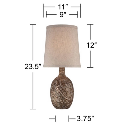 A contemporary design inspired by antique artisan craftmanship, this antique bronze table lamp will accentuate your decor with its sophisticated style. A vase shape base is embedded with hammered texture and given a handsome antique bronze finish. A natural linen tapered cylinder shade on top lends a modern touch to this transitional table lamp.