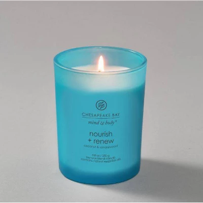 Experience a fragrance-filled journey into wellness with the Nourish and Renew candle in the Mind & Body Collection from Chesapeake Bay Candle®. From the first lighting, you’ll be inspired — the mood-enhancing fragrance infused with pure essential oils and the softly colored frosted glass create a peaceful, spa-like feel. The wood grain lid adds a comforting element of nature, making this candle a beautiful gift for yourself or others.