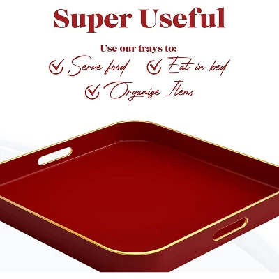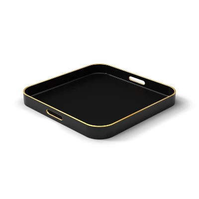 American Atelier Square Decorative Tray, featuring a stunning design with gold trimming. Measuring 13.3 x 13.3 x 1.75 inches, this tray is both stylish and practical, making it a perfect addition to any home. Please note that this decorative tray is for decorative use only and not suitable for food or drink service. Choose from our elegant color options in red or black (sold separately) to complement your home decor. Make a statement at your next gathering with this exquisite American Atelier decorative tray.
