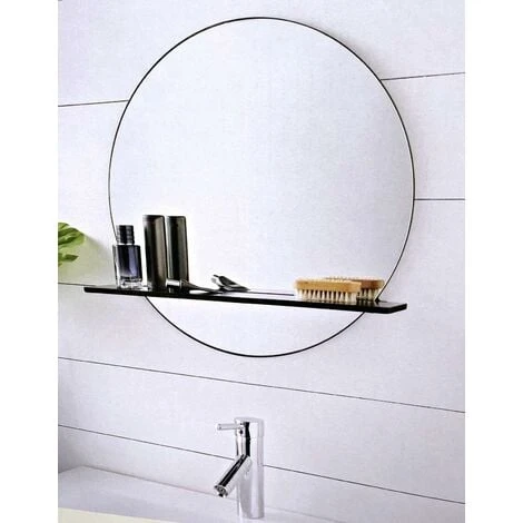 Black Round Bathroom Mirror With Cosmetics Shelf Wall Mounted Metal Frame