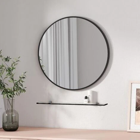 - Round Mirror with Shelf – Framed circle mirror with shelf, perfect for entrance, bathroom, dressing room, bedroom, living room or any space that needs style; The glass shelf provides a convenient spot to store small items, such as toiletries or decorative accents.