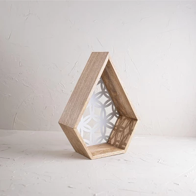 Add a touch of modern flair with this unique wall shelf exclusively from Foreside Home & Garden. Natural sustainable mango wood creates the frame for the geometric wall shelf, backed by clean white metal with a cutout floral pattern. Being both functional and decorative, this shelf adds just the right amount of design and detail to your walls. Great size to display your favorite small potted plant, bud vase with greens, or a flameless candle makes it a wall sconce.