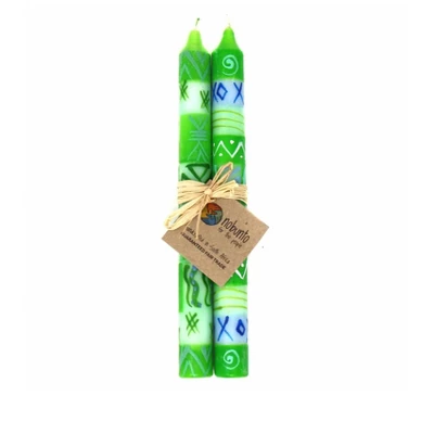These globally-inspired hand-painted candles are small works of art. Crafted by artisans in South Africa, each candle is hand-poured and then individually hand-painted. Each design name is derived from a special African word that is brought to life through the color and patterns which reflect the culture and influences of South Africa. The style images pictured illustrate the general design, but note that each candle is one of a kind. A truly unique and beautiful gift for hostesses, housewarming, wedding, anniversary, and more that make a striking addition to every home and a beautiful conversation piece! Product Features: Design Meaning: In the Zulu language, Sinifisela Ukhisimusi Omuhle – Merry Christmas is what the Zulu want. Christmas in southern Africa is often spent cheerfully and happily in summer weather on the beach. Set of 2 Gift-packaged Dinner Tapers. Candles measure approximately 9-inches tall. Unscented, high-quality, fully-refined paraffin wax from Germany. Non-toxic color pigments and natural wicks. Individually hand-painted. Designs will have differences, but will be consistent in colors and icons that reflect the style. Creates a calm ambiance that transforms any space into a personal sanctuary. Burn time averages 10 hours. High melting point of 58- 60. Use care when burning candles. Do not leave a burning candle unattended; snuff out flame when done burning; do not move burning candle; always use a candle holder when burning. The Story Behind the Art: Each candle is hand poured and hand painted by South African artisans with years of experience. After the candles are poured, they are handed off to the special background painters, who paint the entire wax candle with a base color that sets the tone for the design work that comes next. Masterful artists then paint the designs on each piece. It is truly exciting to watch the lightening-fast strokes of the paintbrushes transform what was molten wax into gorgeously colorful, individualized works of art!