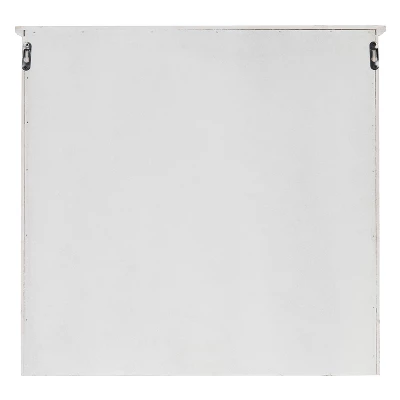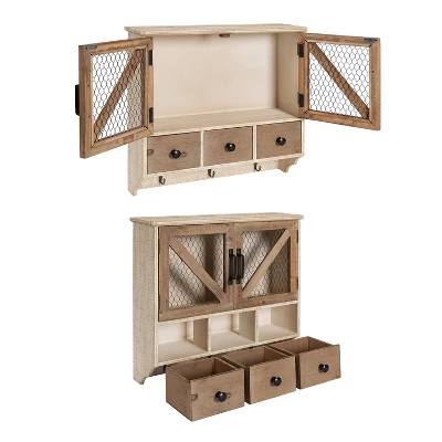 Decorate your home in vintage farmhouse style using this unique hanging wall shelf with a fun chicken wire barndoor front. This hanging cabinet will organize spaces if you only have a bit of wall area but still want smart storage and great looks. It’ll work exceptionally well in an entryway, mudroom, kitchen, bathroom, living room, or guest room. The inner shelves, 3 small drawers, and hooks are great to store all manner of items you want to stock. The double front doors open with vintage metal handles and shut securely with a magnetic clasp. The outer dimensions of this wall storage unit are 20-inches tall x 21-inches wide x 6-inches deep. Two metal keyhole hangers are installed on the back for easy, sturdy wall display. This wall cabinet arrives completely assembled and ready to use.