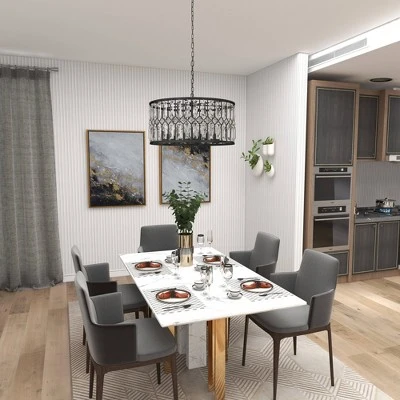 Maximize your ceiling space to add depth and dimensions in your home with this gorgeous chandelier. Beautifully designed and well crafted chandelier features eye catching structure for a mesmerizing focal point any where in your home. Use this black chandelier to cast light on your dining area or den. Requires 6 40W Type A E26/Medium (Standard) bulbs. This item ships in 1 carton. Hang decorative light with hardwired canopy and chain; nails and screws are not included. Suitable for indoor use only. Some assembly required. Includes a hardwire switch. This is a single black colored ceiling light. Glam style.